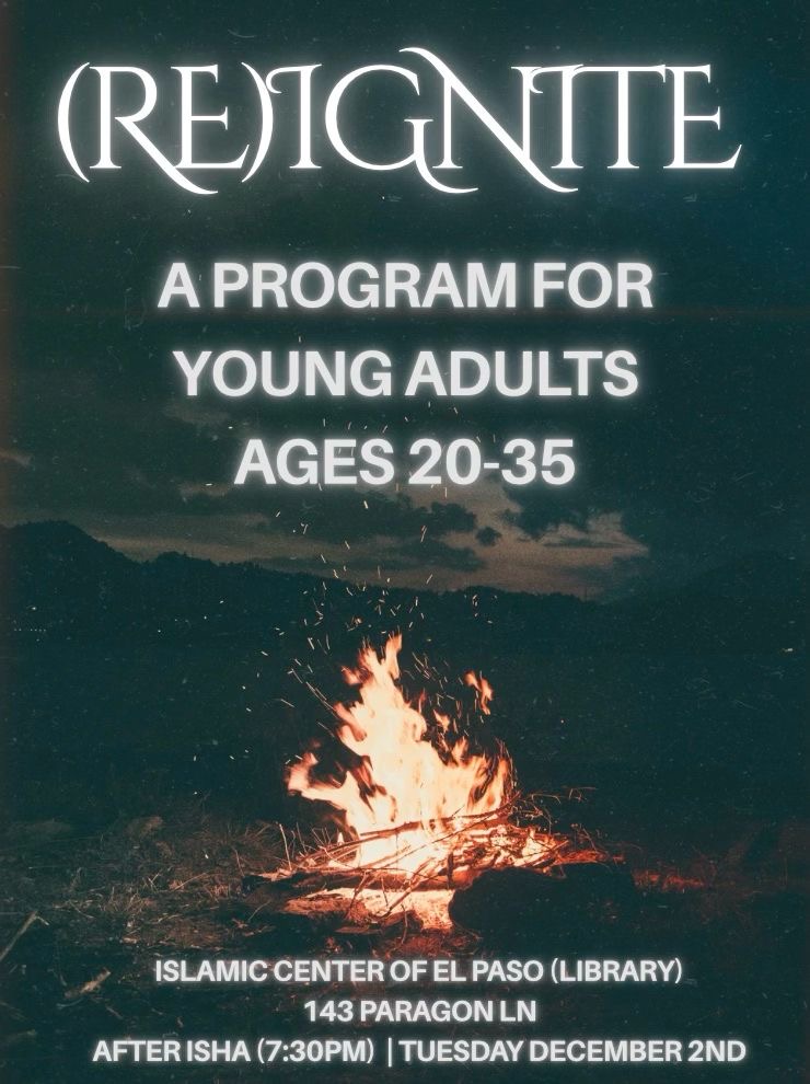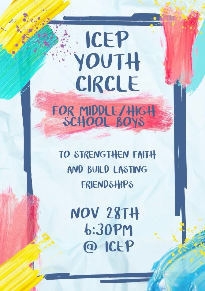 Friday Announcements November 28th 2025 Assalamu Alaikum WaRahmatullahi WaBarakatuhu, NEW ANNOUNCEMENTS: ICEP Youth Circle for Middle/High School Boys, on November 28th at 6:30PM Reignite Program for Young